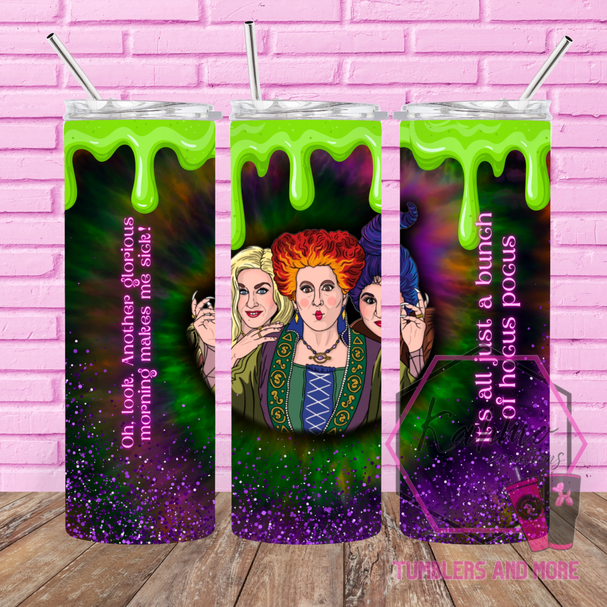 Remember those great times you spent watching your favorite Halloween movie, Now you can relive them every time you take a sip from your tumbler, featuring a bold design of the hocus pocus characters. The perfect accessory to any halloween junkie enthusiast, this skinny tumbler is equipped with a double-walled, stainless-steel insulation to keep your cold drinks cold and your hot drinks hot. With a 20-ounce capacity, this tumbler is large enough to carry what you need, and its snap on lid protects it from spills. The sublimation design allows for an image that lasts for years without cracking. Whether you're on the road or at home, this insulated tumbler is perfect for making sure you stay hydrated, caffeinated, and ready to go! Free plastic straw included with your purchase!