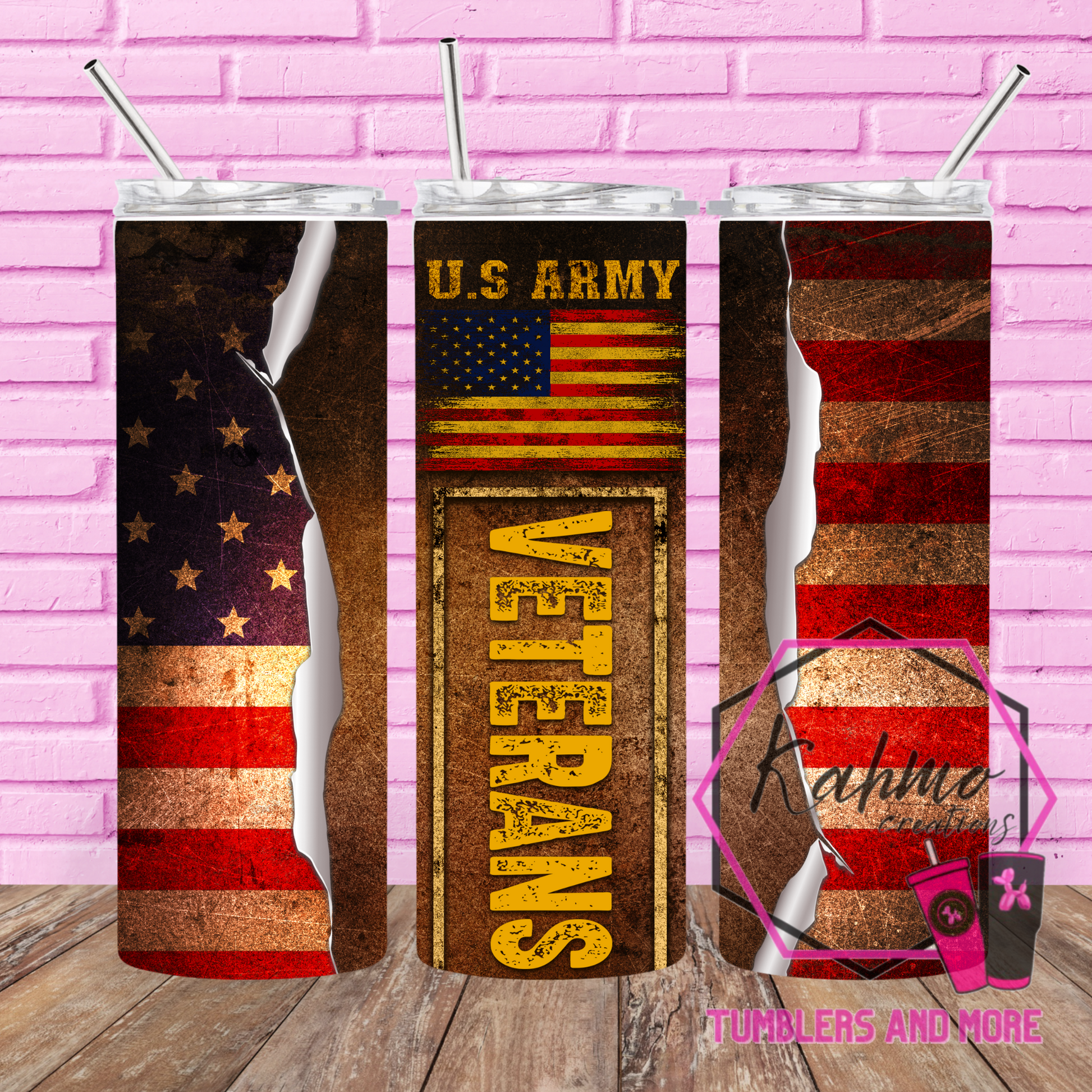 Featuring a bold design of this US Army Veteran tumbler. This skinny tumbler is equipped with a double-walled, stainless-steel insulation to keep your cold drinks cold and your hot drinks hot. With a 20-ounce capacity, is large enough to carry what you need, and its snap on lid protects it from spills. The sublimation design allows for an image that lasts for years without cracking. Whether you're on the road or at home, this insulated tumbler is perfect for making sure you stay hydrated, caffeinated, and ready to go!